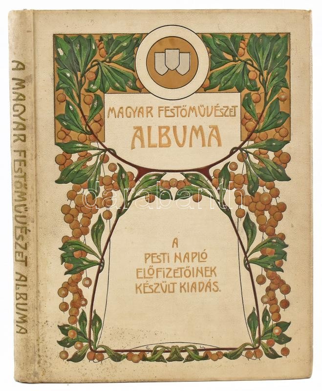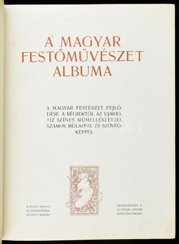 Magyar festőművészet albuma. A magyar festészet fejlődése a régiektől az újakig. Tíz színes műmelléklettel számos műlappal és szövegképpel. A Pesti Napló előfizetőinek készült kiadás. [Bp., 1904], Hornyánszky, 140 p.+10 (műmellékletek, a képek előtt feliratozott hártyapapírral) t. Gazdag szövegközti és egészoldalas képanyaggal illusztrált. Benne Benczur Gyula, Borsos József, Lotz Károly, Madarász Viktor, Munkácsy Mihály, Székely Bertalan, Zichy Mihály és mások. Kiadói szecessziós dúsan aranyozott, festett, egészvászon-kötésben, Gottermayer-kötés, a borítón kis kopásnyomokkal.