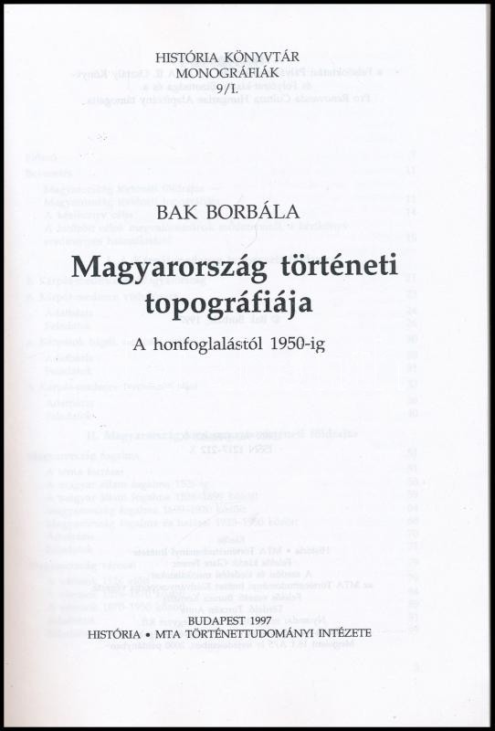 Bak Borbála: Magyarország történeti topográfiája. A honfoglalástól 1950-ig. História Könyvtár Monográfiák 9/I. Bp., 1997, História-MTA Történettudományi Intézet. 5 db térkép-melléklettel. Kiadói papírkötés.