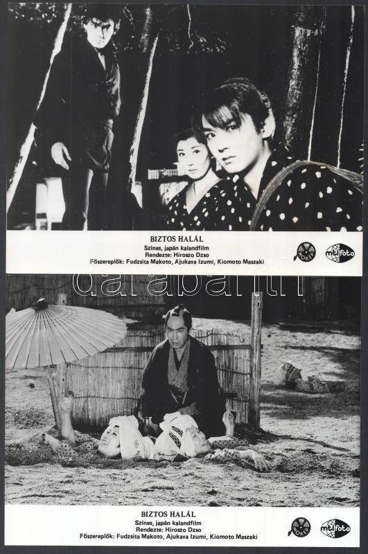 cca 1989 előtt készült a ,,Biztos halál" című japán film jelenetei és szereplői, 6 db vintage produkciós filmfotó, ezüst zselatinos fotópapíron, a használatból eredő (esetleges) kisebb hibákkal, 18x24 cm