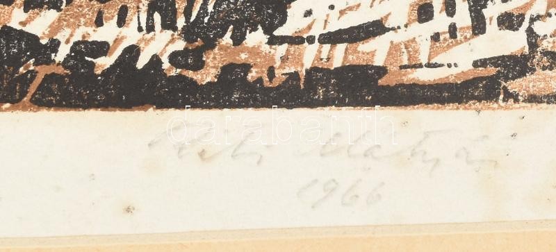 Beschreibung: Réti Mátyás (1922-2002): Kazlas táj. Színes linómetszet, papír, jelzett, kissé foltos, paszpartuban, 25×32 cm