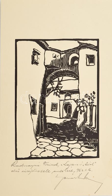 Beschreibung: G.V. monogrammal: Kisvárosi utca (Óbuda?). Linómetszet, papír. Autográf ajándékozási sorokkkal 1962-ből. 17x12 c,