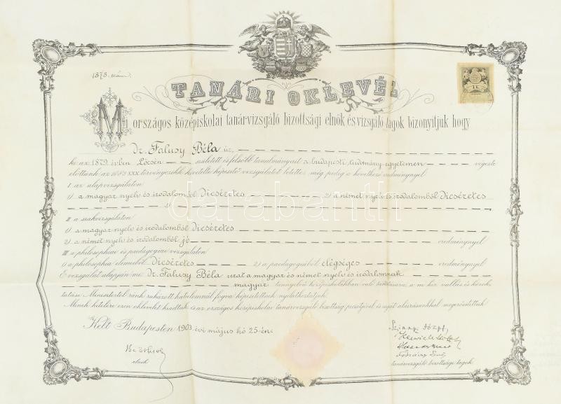 Beschreibung: 1903 Bp., díszes tanári oklevél, angyalos-koronás nagycímerrel, felzetes viaszpecséttel, 1K okmánybélyeggel, hajtott, 58,5x45,5 cm