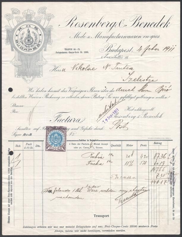 Beschreibung: 1911 Bp., Rosenberg & Benedek Mode- und Manufakturwaren fejléces számlája illetékbélyeggel