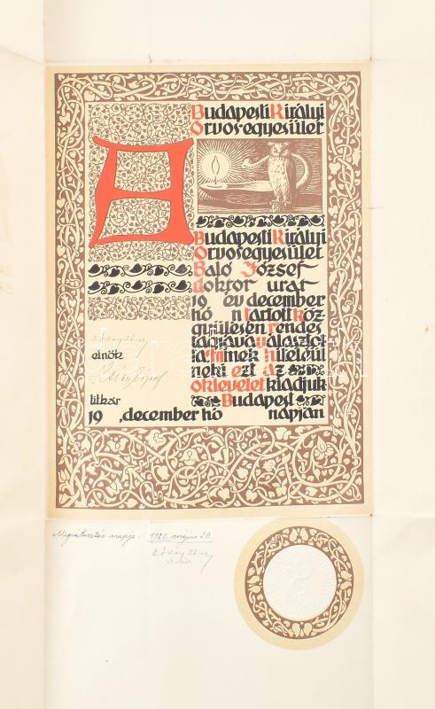 1920 A Budapesti Királyi Orvosegyesület oklevele Dr. Baló József (1895-1979) Kossuth-díjas orvos, patológus részére, az egyesület tagjává választásról, szárazpecséttel