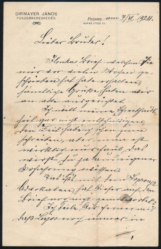 1924 Dirmayer János fűszerkereskedése fejléces levélpapírjára írt levé... https://www.darabanth.com/de/426-Fernauktion/426.0/Kunst-Dokumente-andere-Sammelgebiete/Dokument~500020/1924-Dirmayer-Janos-fuszerkereskedese-fejleces-levelpapirjara-irt-level~II2721932