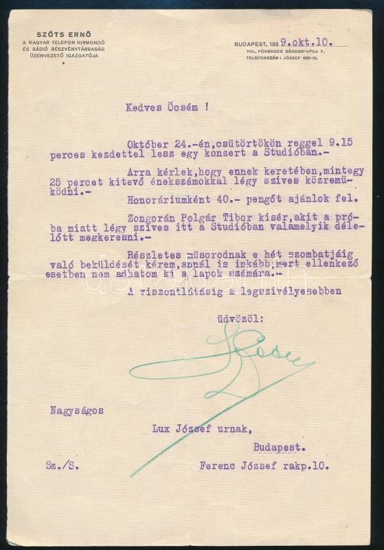 Beschreibung: 1929 Szőts Ernő, a Magyar Telefon Hírmondó és Rádió Részvénytársaság igazgatójának gépelt levele koncerttel kapcsolatban