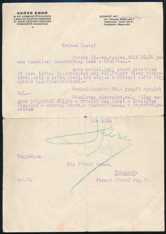 1929 Szőts Ernő, a Magyar Telefon Hírmondó és Rádió Részvénytársaság i... https://www.darabanth.com/de/426-Fernauktion/426.0/Kunst-Dokumente-andere-Sammelgebiete/Dokument~500020/1929-Szots-Erno-a-Magyar-Telefon-Hirmondo-es-Radio-Reszvenytarsasag-igazgatojanak-gep~II2718398