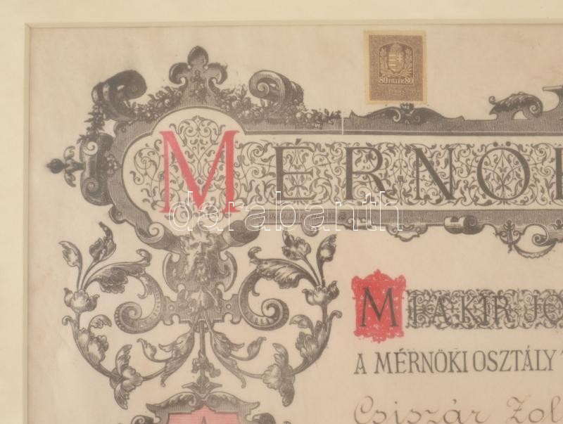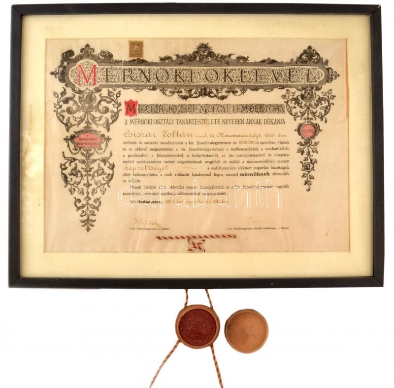 1931 Mérnöki diploma Csiszár Zoltán részére függő viaszpecséttel üvege... https://www.darabanth.com/de/426-Fernauktion/426.0/Kunst-Dokumente-andere-Sammelgebiete/Dokument~500020/1931-Mernoki-diploma-Csiszar-Zoltan-reszere-fuggo-viaszpecsettel-uvegezett-keretben-50x70-~II2716146