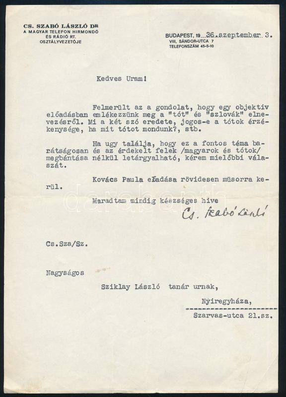 1936 Cs. Szabó László (1905-1984) író levele Sziklay László (1912-1987... https://www.darabanth.com/de/426-Fernauktion/426.0/Kunst-Dokumente-andere-Sammelgebiete/Dokument~500020/1936-Cs-Szabo-Laszlo-1905-1984-iro-levele-Sziklay-Laszlo-1912-1987-reszere~II2721132