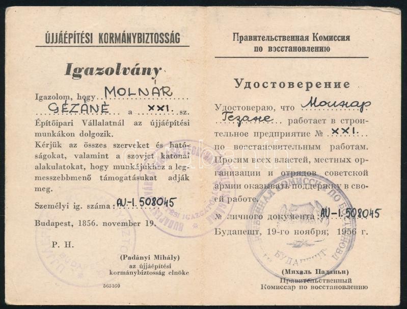 1956. nov. 19. Bp., Újjáépítési Kormánybizottság által kiállított kétnyelvű igazolvány, magyar és orosz nyelven, a magyar nyelvű részen az évszám 1956 helyett tévesen 1856. Tévnyomat, gyűjtői ritkaság!