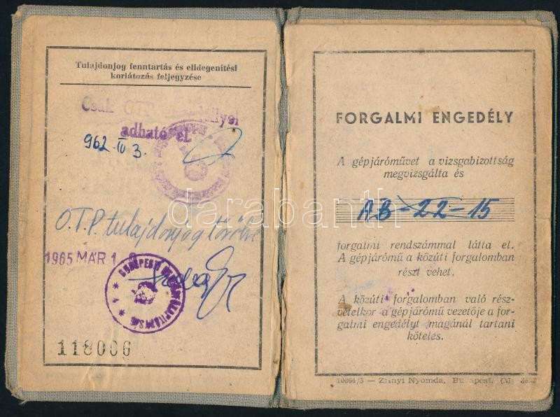 1962 Gépjármű forgalmi engedély https://www.darabanth.com/de/426-Fernauktion/426.0/Kunst-Dokumente-andere-Sammelgebiete/Dokument~500020/1962-Gepjarmu-forgalmi-engedely~II2722897