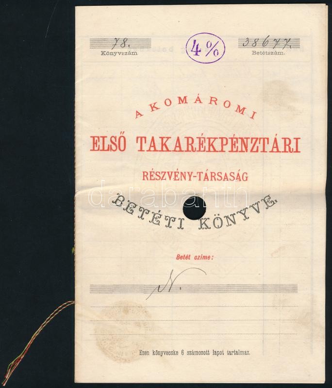 1892 A komáromi Első Takarékpénztári Részvénytársaság betéti könyve https://www.darabanth.com/de/426-Fernauktion/426.0/Kunst-Dokumente-andere-Sammelgebiete/Drucksachen~1000004/1892-A-komaromi-Elso-Takarekpenztari-Reszvenytarsasag-beteti-konyve~II2723385