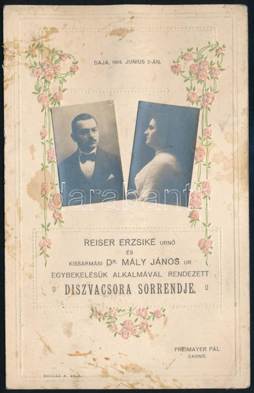 1914 Fényképes díszvacsora menükártya Reiser Erzsike és Kissármási Dr.... https://www.darabanth.com/de/426-Fernauktion/426.0/Kunst-Dokumente-andere-Sammelgebiete/Drucksachen~1000004/1914-Fenykepes-diszvacsora-menukartya-Reiser-Erzsike-es-Kissarmasi-Dr-Maly-Janos-egybekel~II2723808