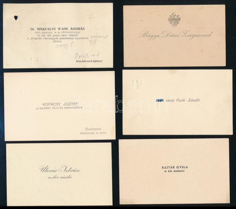 Beschreibung: 6 db régi névjegykártya (nemesi, katonatiszti, Kopácsy József a "Bajtárs" folyóirat szerkesztője)