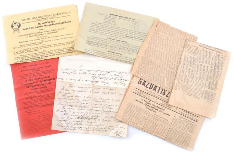 cca 1940-1955 Vegyes papírrégiség tétel: Steyr-Austro Daimler-Puchművek Rt. számla, Gergely Béla Budatétény baromfitenyésztő reklámnyomtatvány, újságok, stb., összesen 7 db, vegyes állapotban