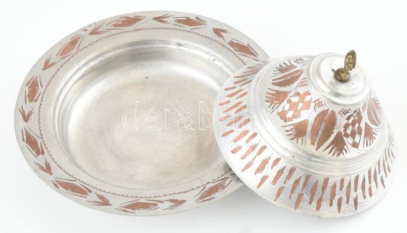 Beschreibung: Bosnyák fedeles fém kínálótál vésett mintával, d: 18 cm