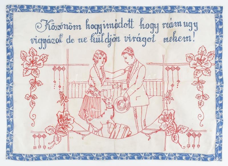 Beschreibung: Régi vászon falvédő a Meseautó című film dalszövegével, szakadással, 50×76 cm