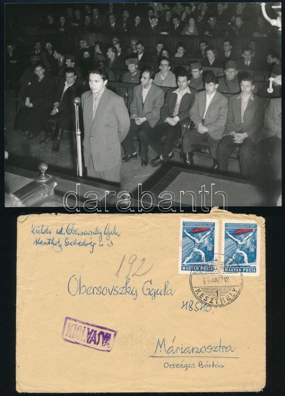 cca 1957-60 3 db 1956--os forradalomal kapcsolatos tétel: Obersovszky Gyula és Gáli József 1956-os forradalmárok, halálraítéltek a bíróság előtt 1957-ben, fotó, későbbi előhívás, hátoldala kissé sérült. 13x18 cm + Tótjh Ilona 1956-os forradalmár, később kivégzett halálraítélt az Elnöki Tanácsnak küldött levelének fénymásolata, amelyben kegyelemért folyamodik. 3 beírt oldal. + id. Obersovszky Gyula, Obersovszky Gyula 1956-os forradalmár apja által a fiának Márianosztrára, a börtönbe küldött levelének borítékja.