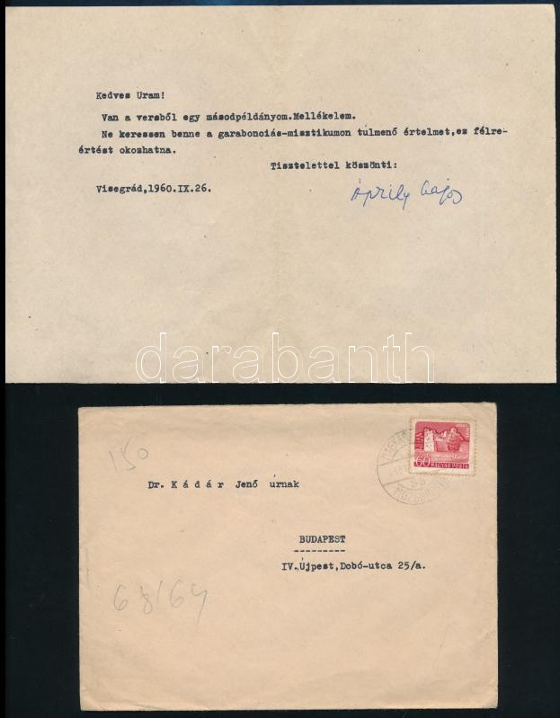 Beschreibung: 1960 Áprily Lajos (1887-1967) költő,műfordító gépelt levele, rajta saját kezű aláírásával, borítékkal.
