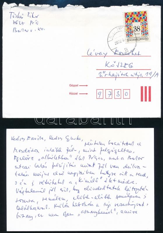 Beschreibung: 2002 Tüskés Tibor (1930-2009) saját kézzel írt levele, eredeti borítékjában