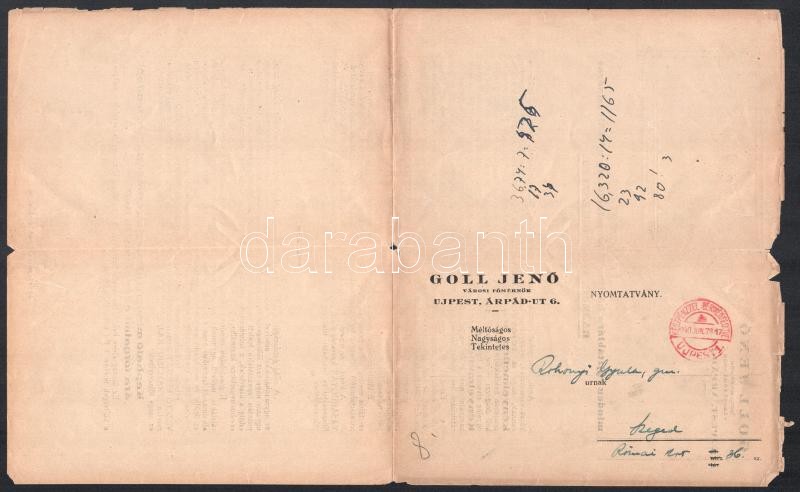 1940 Újpest, Goll Jenő okl. gépészmérnök, városi főmérnök reklámnyomta... https://www.darabanth.com/de/426-Fernauktion/426.0/Kunst-Dokumente-andere-Sammelgebiete/Werbungen~500024/1940-Ujpest-Goll-Jeno-okl-gepeszmernok-varosi-fomernok-reklamnyomtatvanya-rajztabla~II2681200