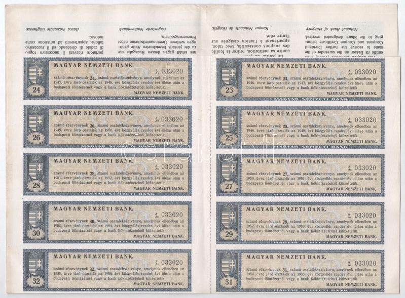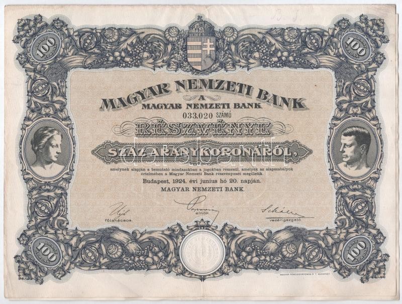 Budapest 1924. "Magyar Nemzeti Bank" magyar, angol, francia, német és olasz nyelvű részvénye 100 Arany Koronáról, szárazpecséttel és szelvényekkel T:III