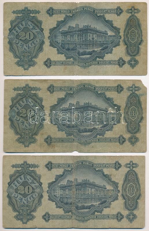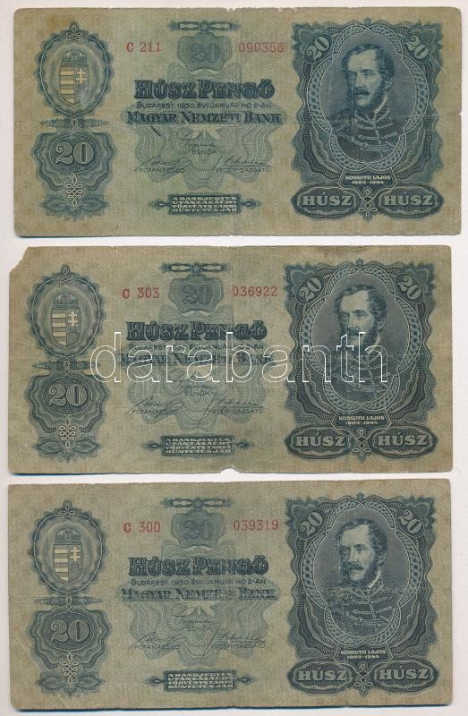 1930. 20P (3x) T:III- szakadások Adamo P11 https://www.darabanth.com/de/426-Fernauktion/426.0/Numismatik/Ungarische-Banknoten~2000007/1930-20P-3x-TIII-szakadasok-Adamo-P11~II2696205