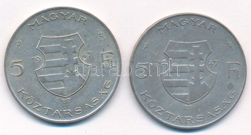 1947. 5Ft Ag "Kossuth" (2x) T:2-,3 Adamo F8.1 https://www.darabanth.com/de/426-Fernauktion/426.0/Numismatik/Ungarische-Munzen-und-Munzen-mit-ungarischem-Munzzeichen~2000008/1947-5Ft-Ag-Kossuth-2x-T2-3-Adamo-F81~II2715262