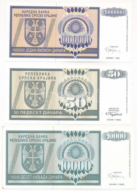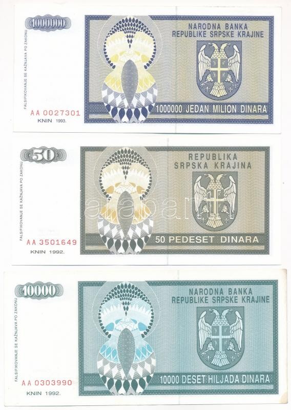 Horvátország / Krajna Szerb Köztársaság / Knin 1992. 50D + 10.000D + 1993. 1.000.000D T:I--III az egyiken kis folt