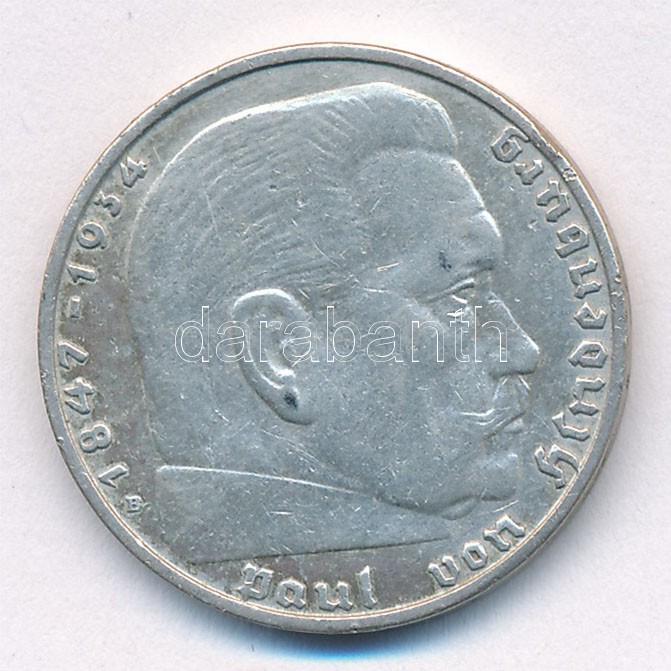 German Third Reich 1938B 2 Mark Ag "Hindenburg" C:XF,VF patina, edge error, scratch