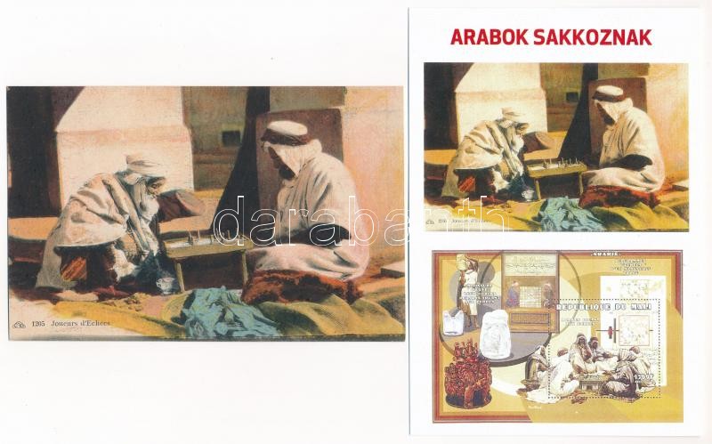 2 db képeslap: arabok sakkoznak eredeti régi képeslap + modern reprint magyar változata / 2 chess postcards: 1 pre-1945 Arabian chess game + its Hungarian modern reprint