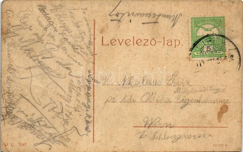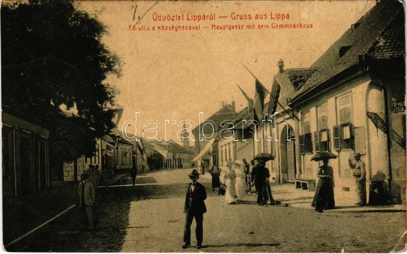 1910 Lippa, Lipova; Fő utca, Községháza, Singer Antal üzlete, magyar zászlók. W.L. 3047. / Hauptgasse mit dem Gemeindehaus / main street with town hall, shop, Hungarian flags (kis szakadás / small tear)