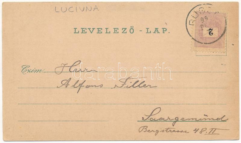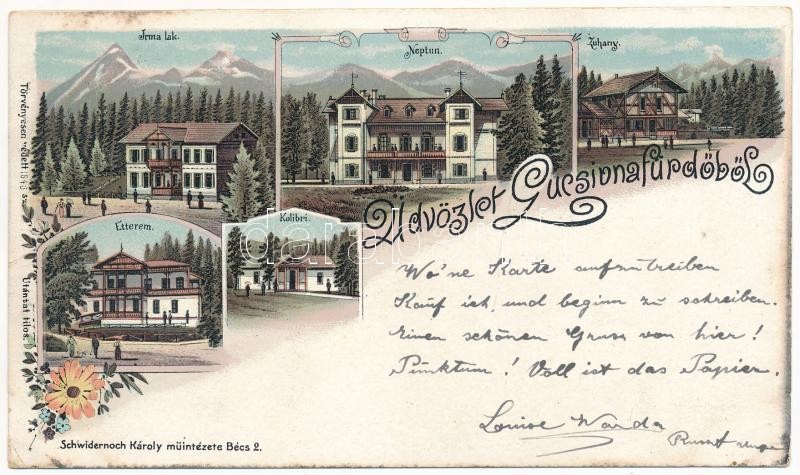 1899 (Vorläufer) Lucsivna, Lautschburg, Lucivná (Magas-Tátra, Vysoké Tatry); Irma lak, Neptun szálloda, Zuhany-fürdő, étterem, Kolibri nyaraló. Schwidernoch Károly műintézete / villas, hotel, restaurant, bath. Art Nouveau, floral, litho (EK)