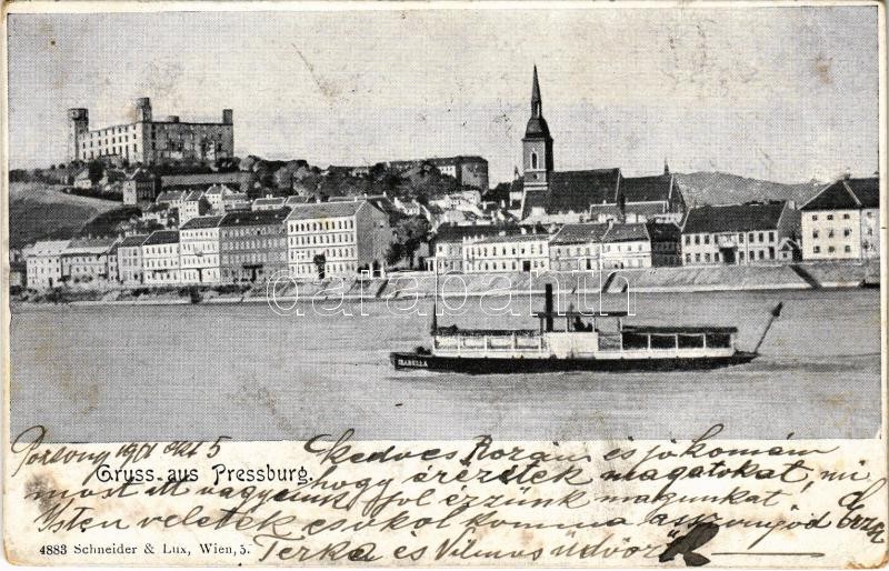 Beschreibung: 1901 Pozsony, Pressburg, Bratislava; látkép, vár, "IZABELLA" gőzhajó. Schneider & Lux / general view, castle, steamship (fl)
