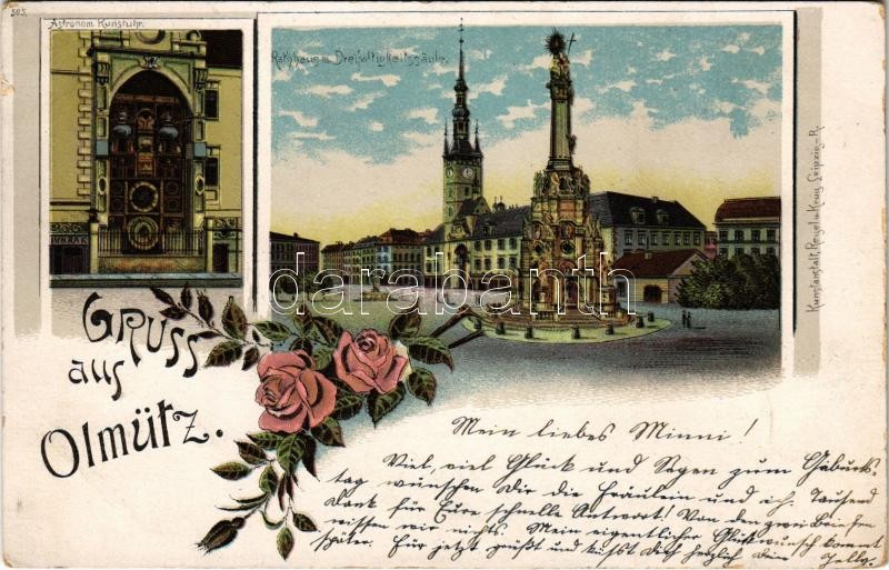 1897 (Vorläufer!) Olomouc, Olmütz; Astronom. Kunstuhr, Rathaus u. Dreifaltigkeitssäule / astronomical clock, town hall, Holy Trinity statue. Kunstanstalt Regel u. Krug Art Nouveau, floral, litho (EK)