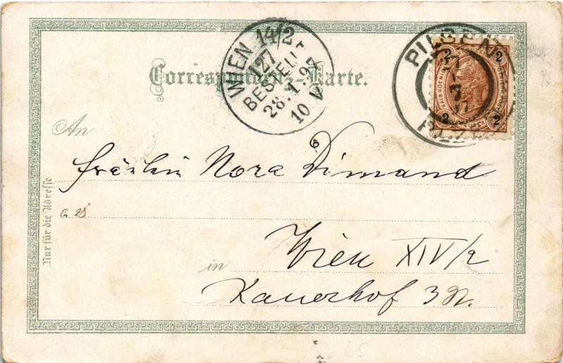 1897 (Vorläufer!) Plzen, Pilsen; Stadtansicht, Stadtpark, Gymnasium, Bürgerliches Bräuhaus, Erste Pilsner Actienbrauerei, Stadtkirche, Rathaus / general view, park, grammar school, brewery, beer factory, church, town hall. Kunstdruck Kretzschmar & Schatz Art Nouveau, floral, litho (worn corners)