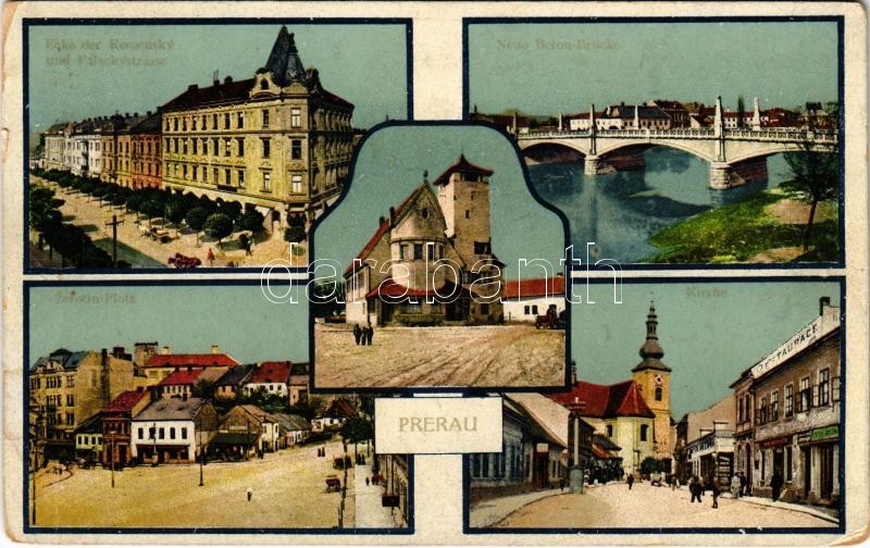 Beschreibung: 1917 Prerov, Prerau; Neue Beton-Brücke, Kirche / street view, bridge, square, church, restaurant, shops (worn corners)