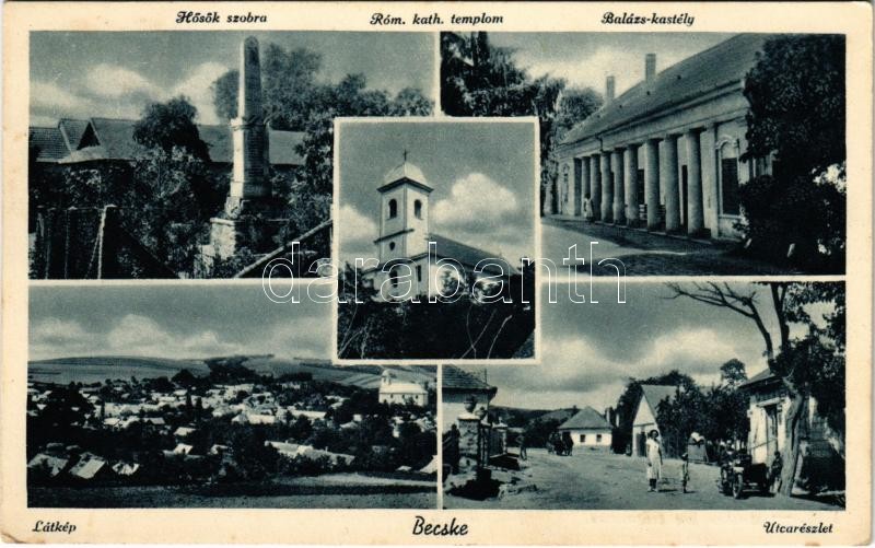 1939 Becske, Római katolikus templom, Hősök szobra, Balázs kastély, ut... https://www.darabanth.com/de/427-Fernauktion/427.0/Ansichtskarten/Ungarn~1000004/1939-Becske-Romai-katolikus-templom-Hosok-szobra-Balazs-kastely-utca-oldalkocsis-motorkerC3~II2725277