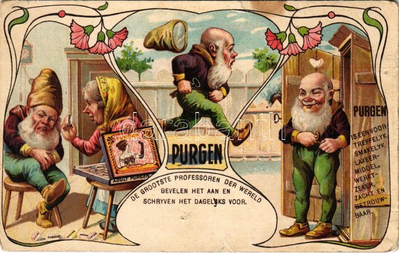 "Az új ideális hashajtó" Purgo törpés litho reklámlap / Purgen is een voortreffelyk, smakelyk, laxeermiddel, werktzeker, zacht en betrouwbaar / "Purgen" laxative advertisement with dwarves, toilet humour. Art Nouveau, litho (lyuk / pinhole)