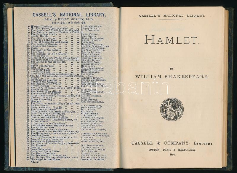 William Shakespeare: Hamlet. Cassell's National Library. London, 1894., Cassell & Co. Angol nyelven. Korabeli kartonált papírkötés, ceruzás aláhúzásokkal.