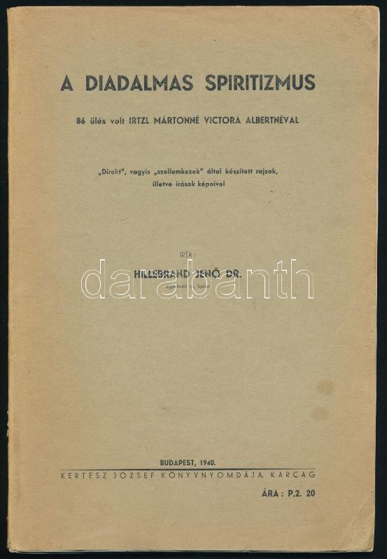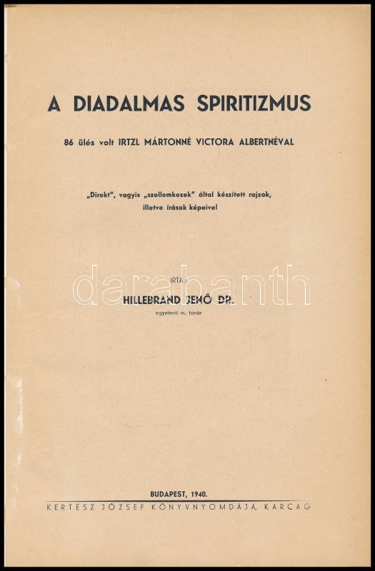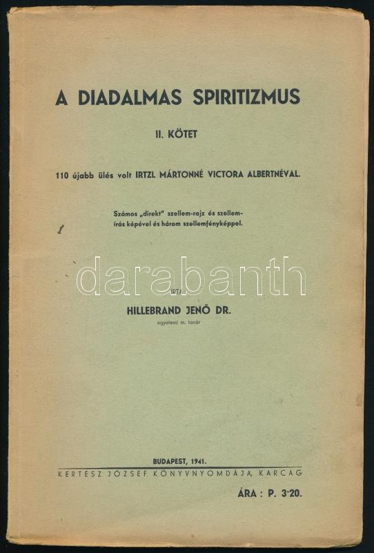 Dr. Hillebrand Jenő: A diadalmas spiritizmus. I-II. köt. Bp., 1940-1941, szerzői kiadás (Karcag, Kertész József-ny.), 1 t.+63 p.+6 t., 1 t.+57+(3) p.+17 t. Egészoldalas fekete-fehér fotókkal. Kiadói papírkötés, a borítókon foltokkal, néhány lapon kisebb ázásnyomokkal, az első kötet laza, szétváló fűzéssel.