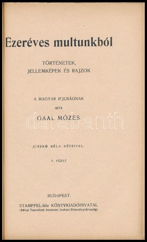 Gaal Mózes: Ezeréves multunkból. Történetek, jellemképek és rajzok. III./V. füzet. Gaál Mózes történeti elbeszélései. A Magyar Asszony ajándéka az ifjúság számára. Bp., 1933, (Révai-ny.), 43 p.+3 t.+48 p.+2 t. Juszkó Béla egészoldalas képeivel illusztrálva. Kiadói papírkötés, kopottas borítóval, kissé sérült lapszélekkel.