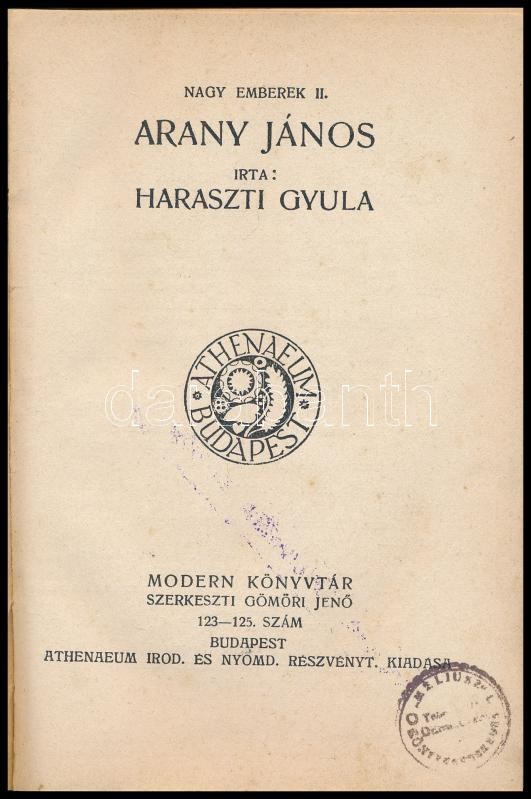 Haraszti Gyula: Arany János. Nagy emberek II. Modern Könyvtár 123-125. sz. Bp., 1912, Athenaeum, 118 p. Átkötött félvászon-kötésben, márványozott lapélekkel, helyenként kissé foltos lapokkal, ceruzás bejegyzésekkel.