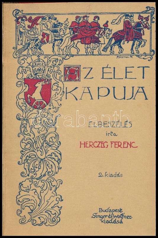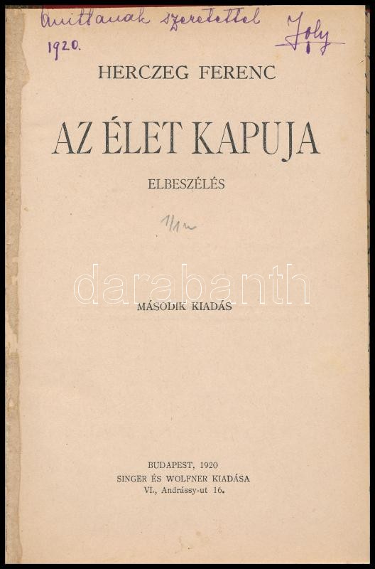 Herczeg Ferenc: Az élet kapuja. Elbeszélés. Bp., 1920, Singer és Wolfner, 128 p. Második kiadás. A borító Mühlbeck Károly munkája. Átkötött egészvászon-kötésben, márványozott lapélekkel, a borítón kis kopással, ajándékozási bejegyzéssel, az eredeti papírborító bekötve.