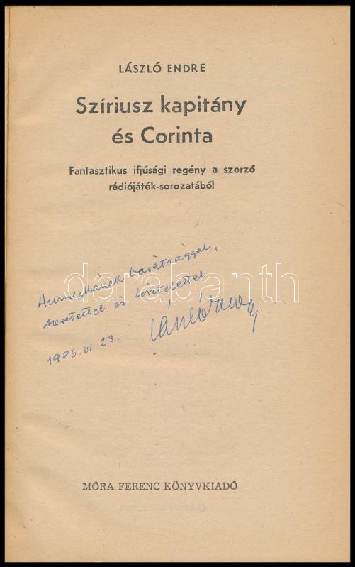 László Endre: Szíriusz kapitány és Corinta. A szerző, László (1900-1987) író által Major Anna (1932-2021) dramaturg,a Szabó - család dramaturgja részére DEDIKÁLT példány. Fantasztikus ifjúsági regény. Viszt György rajzaival. Bp., 1986., Móra. Kiadói papírkötés