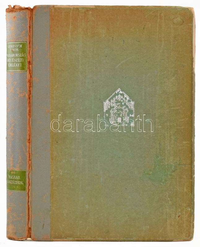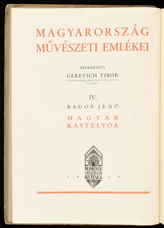 Rados Jenő: Magyar kastélyok. Gerevich Tibor előszavával. Magyarország művészeti emlékei IV. köt. Bp.,1939, Műemlékek Országos Bizottsága - Kir. M. Egyetemi Nyomda, 404+1 p. +1 (kihajtható térképvázlat) t.+11 (kép mellékletek) t. A 79-394 oldalak között, I-től CLVIII-ig számozott fekete-fehér képtáblával. Gazdag szövegközti fekete-fehér képanyaggal illusztrált. Kiadói félbőr-kötésben, kopott, foltos borítóval, sérült gerinccel.