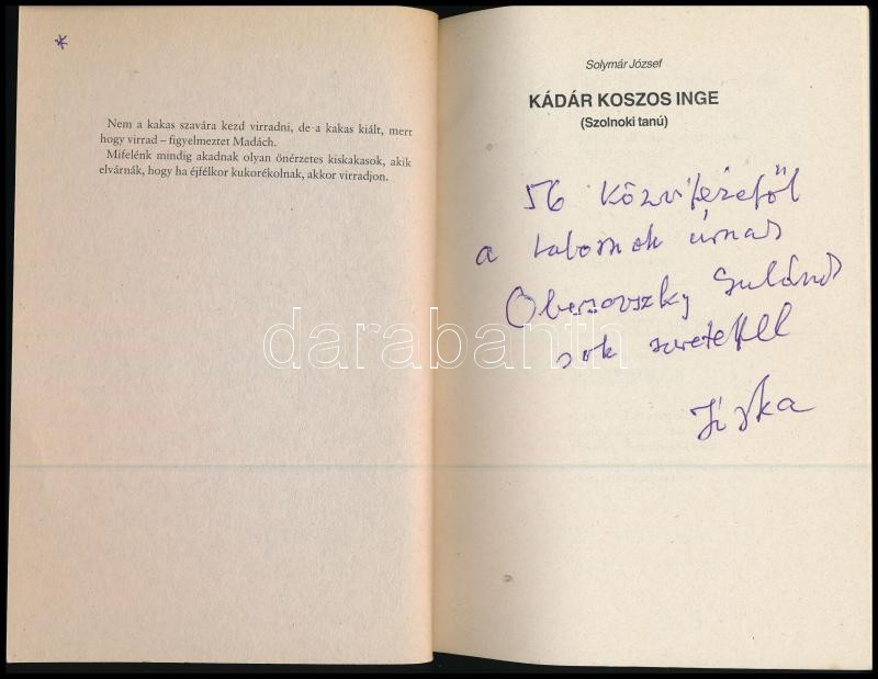 Solymár József: Kádár koszos inge. (Szolnoki tanú). Lopják a forradalmat! 1956-1996. Bp., 1996, szerzői magánkiadás. Kiadói papírkötés. A szerző által Obersovszky Gyula (1927-2001) költő, író, újságíró, 1956-os forradalmár részére DEDIKÁLT példány.
