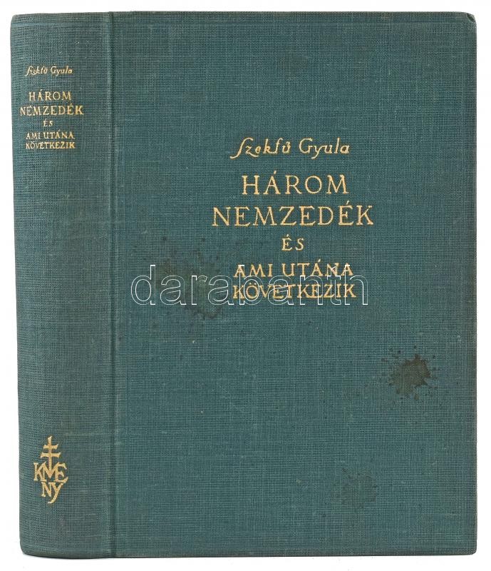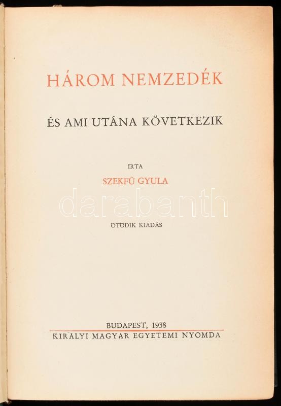 Szekfű Gyula: Három nemzedék és ami utána következik. Bp., 1938, Kir. M. Egyetemi Nyomda. 514 p. Ötödik kiadás. Kiadói aranyozott egészvászon-kötés, kissé foltos borítóval.