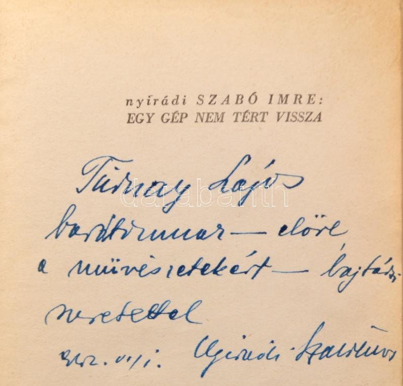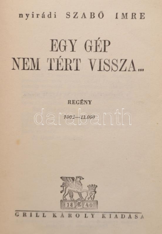 nyirádi Szabó Imre: Egy gép nem tért vissza... Bp, 1941, Grill Károly.... https://www.darabanth.com/de/427-Fernauktion/427.0/Bucher/Bucher-Militaria~1500012/nyiradi-Szabo-Imre-Egy-gep-nem-tert-vissza-Bp-1941-Grill-Karoly-279-p-Erosen-serult-~II2728318