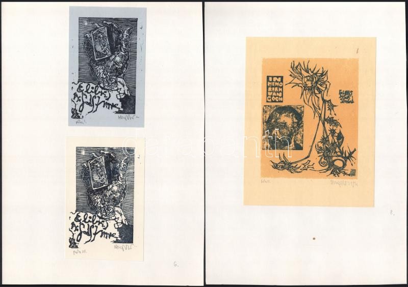 Beschreibung: König (Kőnig) Róbert (1951-2014): Ex libris Dr. Soós Imre (3 db), jelzett, két papírlapra kasírozva, 17,5x13,5 cm és 12,5x8 cm méretben
